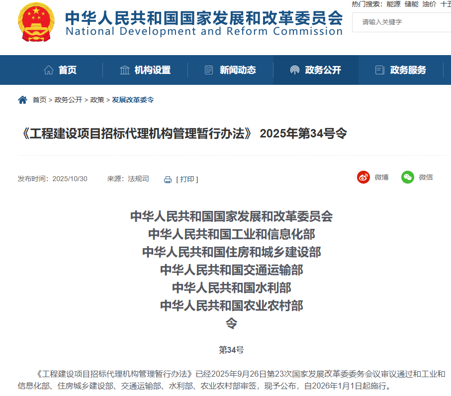 《工程建設(shè)項目招標(biāo)代理機(jī)構(gòu)管理暫行辦法》已經(jīng)2025年9月26日第23次國家發(fā)展改革委委務(wù)會議審議通過和工業(yè)和信息化部、住房城鄉(xiāng)建設(shè)部、交通運(yùn)輸部、水利部、農(nóng)業(yè)農(nóng)村部審簽,現(xiàn)予公布,自2026年1月1日起施行。